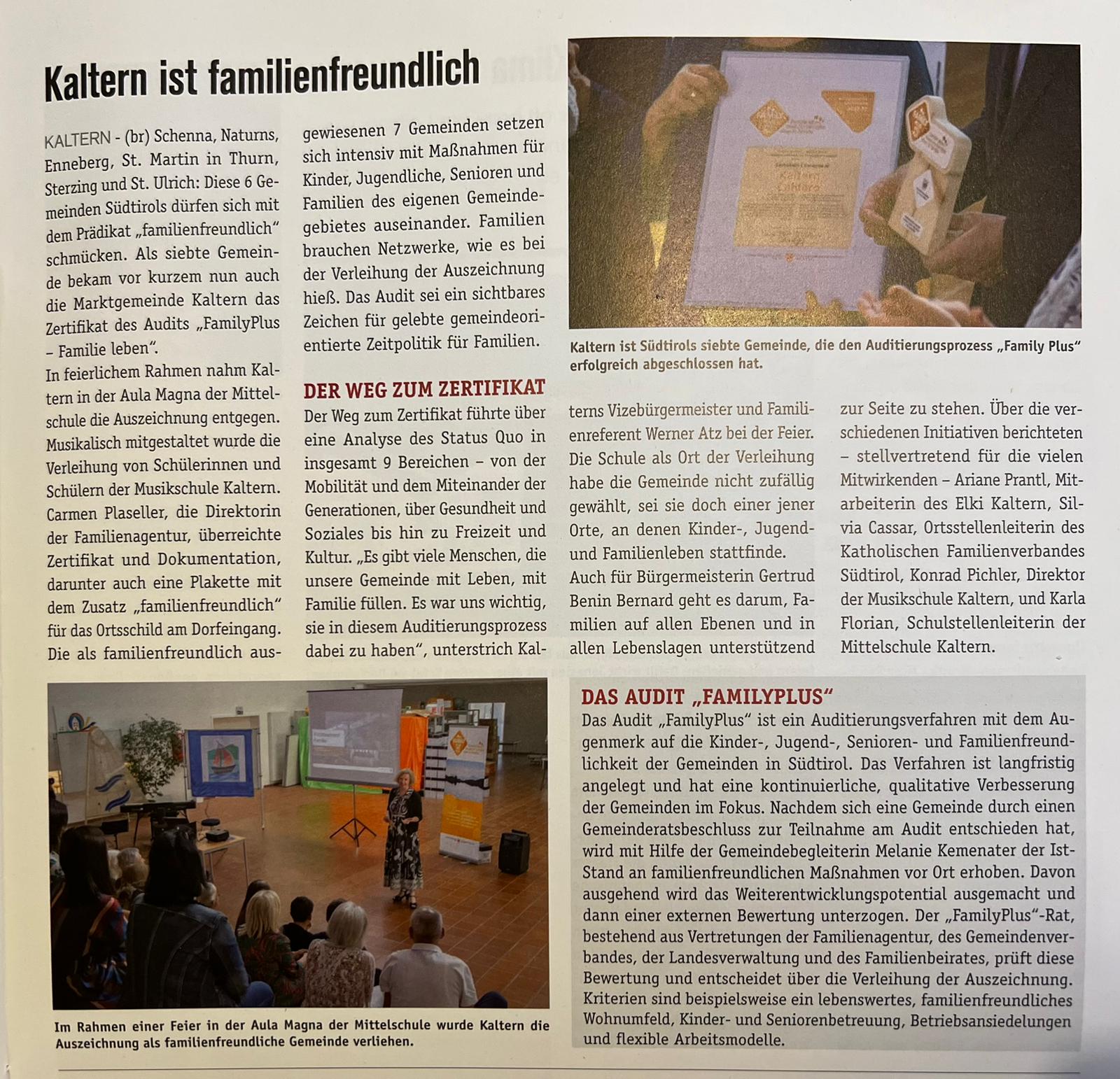 - Familien brauchen Netzwerke - Kaltern ist familienfreundliche Gemeinde (Tageszeitung 08.09.2023)