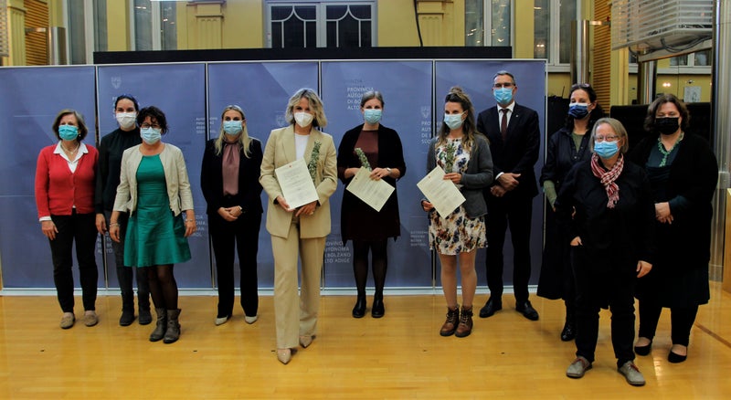 - Die Preisträgerinnen (mit Diplom v.l.) Lucich, Leimstädtner und Rainer (Daniela Gelsi fehlt) im Gruppenfoto mit LH Kompatscher und der Bewertungskommission. (Foto: LPA/Guido Steinegger) » [IMG 1 MB]