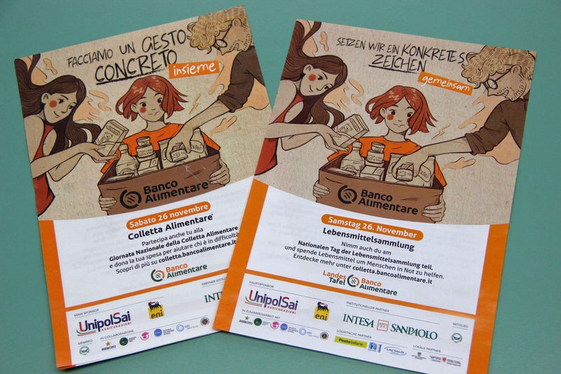 Am morgigen Samstag (26. November) werden auf dem gesamten Staatsgebiet Lebensmittel gesammelt, um diese bedürftigen Mitmenschen zur Verfügung zu stellen. In Südtirol hat die Landestafel/Banco Alimentare in 88 Geschäften in ganz Südtirol dafür Sammelstellen eingerichtet.