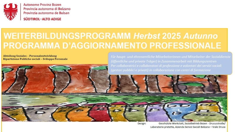 BOZEN (LPA). Palliative Care in den Seniorenwohnheimen, Medienkompetenz in der Arbeit mit Jugendlichen, Grundkurs oder Fortgeschrittenenkurs für Gebärdensprache oder Kommunikationsmöglichkeiten mit Menschen mit Demenz: Das Kursangebot der Abteilung Soziales ist auch in anstehenden Herbst wieder dicht gefüllt. Organisiert wird das Programm gemeinsam mit mehreren Bildungsanbietern, es richtet sich an hauptamtliche Mitarbeiterinnen und Mitarbeiter der (privaten und öffentlichen) Sozialdienste ebenso wie an interessierte, ehrenamtlich sozial engagierte Bürgerinnen und Bürger.