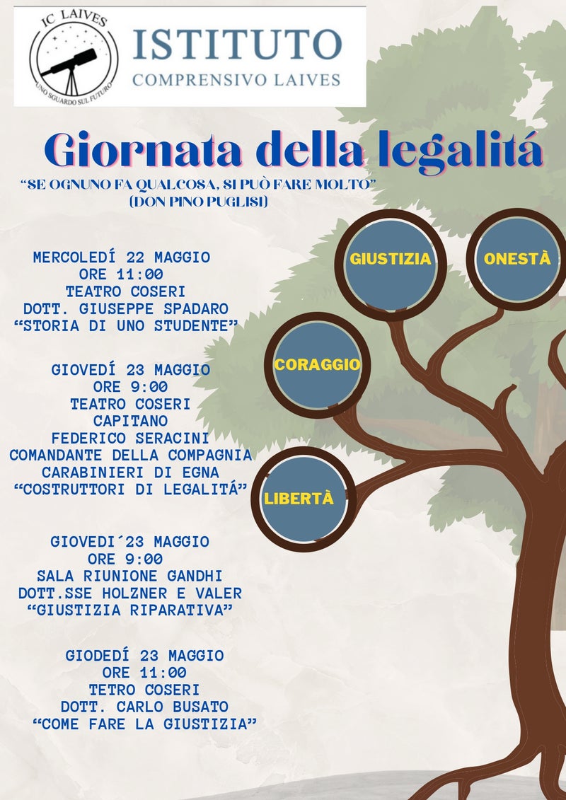 Am 22. und 23. Mai, anlässlich des Tages der Legalität, lädt das italienische Schulzentrum Leifers ("Istituto comprensivo") ihre Schüler ein, sich mit dem Thema Legalität, Legitimität und Einhaltung von Regeln auseinanderzusetzen.