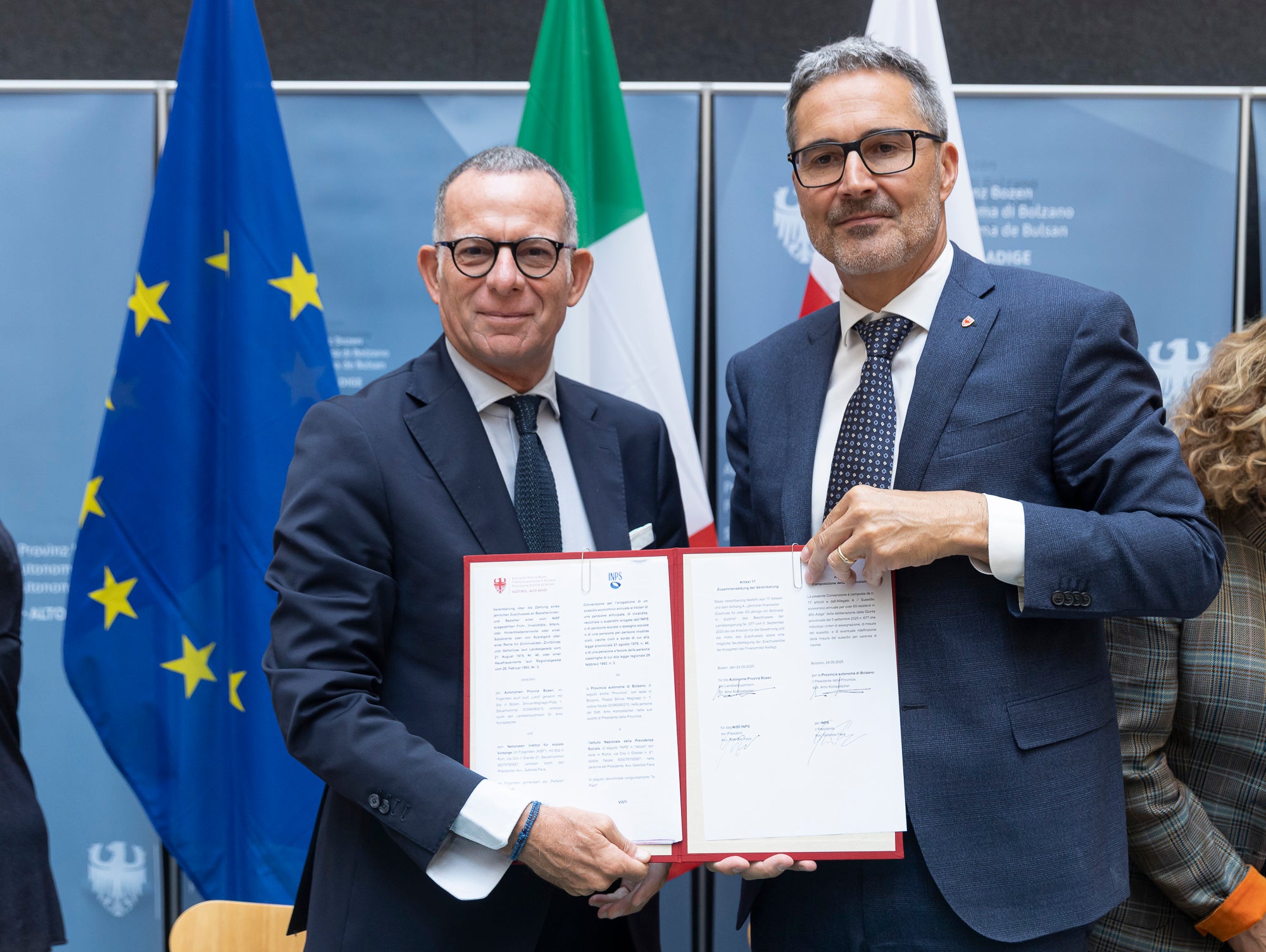 - Die am 24. September in Bozen unterzeichnete Vereinbarung gilt für drei Jahre. INPS-Präsident Fava und Landeshauptmann Kompatscher haben das Abkommen am 24. September in Bozen unterzeichnet. (Foto: LPA/Tiberio Sorvillo) » [IMG 1 MB]