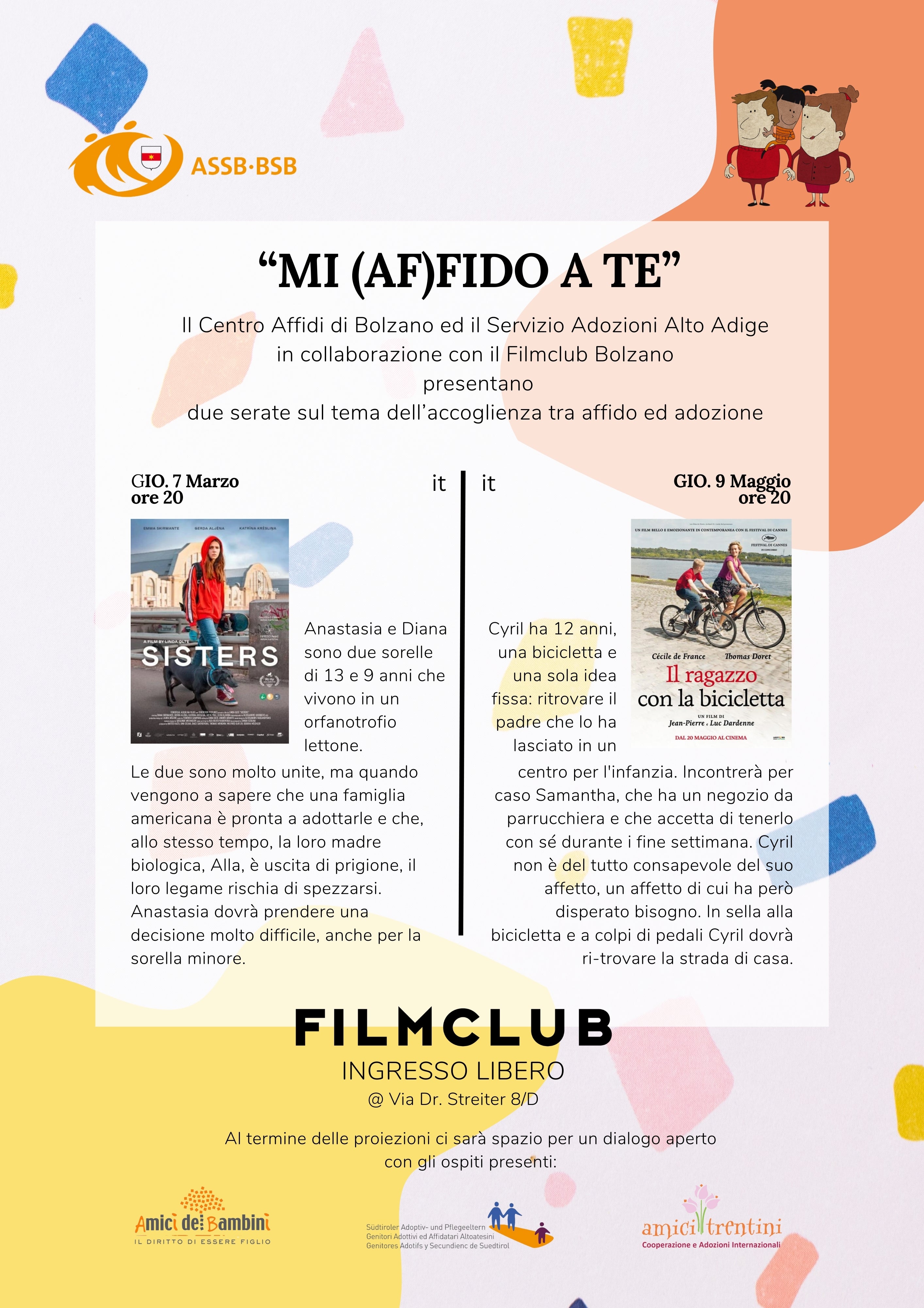 Quella in programma giovedì al Filmclub è la seconda proiezione, dopo quella avvenuta a marzo con il film “Sisters”. Al termine della proiezione è previsto un momento di confronto con una tavola rotonda alla quale parteciperanno ospiti dell’Associazione Amici dei Bambini (Ai.Bi), l’Associazione Amici Trentini e l’Associazione Genitori Adottivi ed Affidatari Altoatesini.